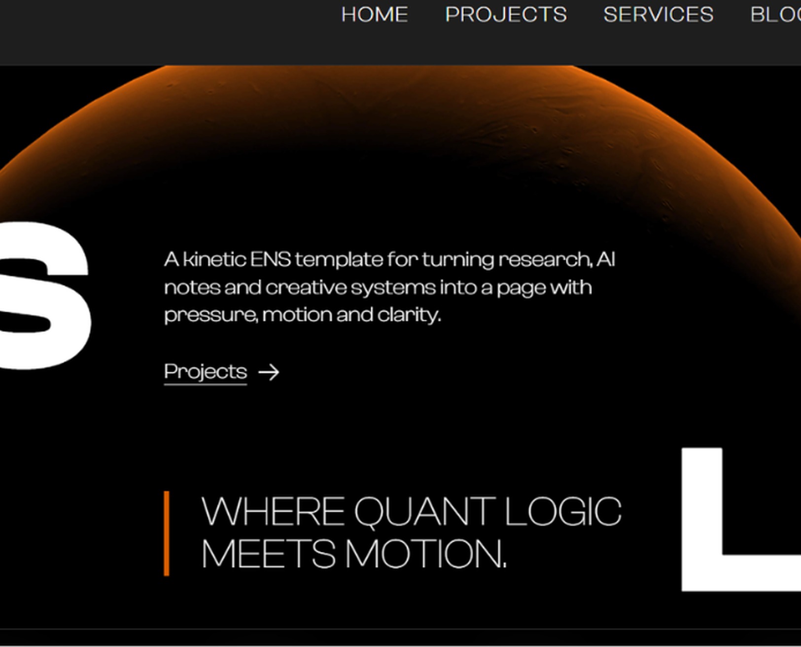 A kinetic ENS template for turning research, AI notes and creative systems into a page with pressure, motion and clarity.